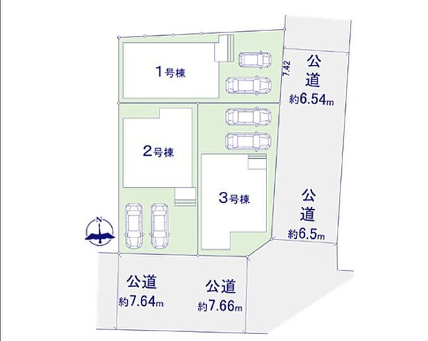 3号棟:南7.4m 東6.5m /2号棟:南7.4m /1号棟:東6.5m