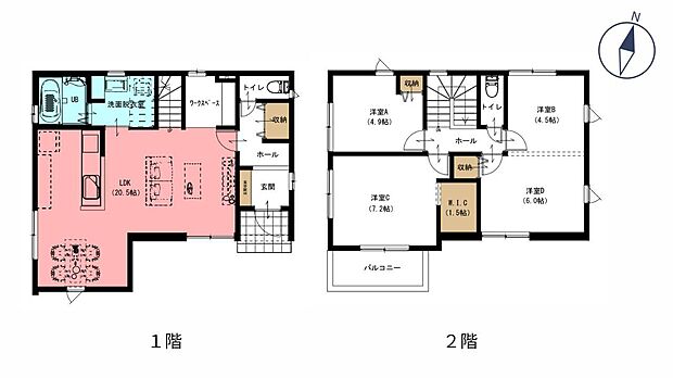 間取り内訳:リビングダイニングキッチン 20.5帖(1階)・収納 2帖(1階)・洋室 4.9帖(2階)・洋室 7.2帖(2階)・洋室 10.5帖(2階)