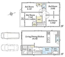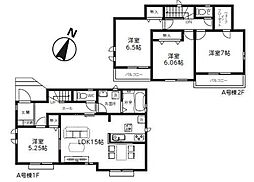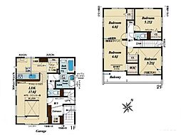 | 間取り | 4SLDK 間取り内訳:リビングダイニングキッチン 17帖(1階)・収納 1.5帖(2階)・洋室 7.5帖(2階)・洋室 6.1帖(2階)・洋室 5帖(2階)・和室 5畳(1階) |
