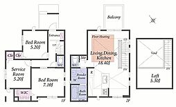 | 間取り | 1SLDK 間取り内訳:洋室 5.3帖(1階)・収納 6.7帖(1階)・収納 5.4帖(1階)・リビングダイニングキッチン 18.8帖(2階)・その他 6.2帖(2階) |