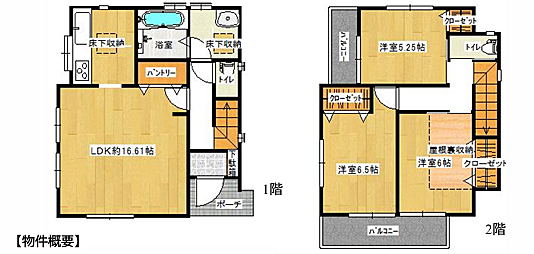間取り内訳:リビングダイニングキッチン 16.6帖(1階)・洋室 6.5帖(2階)・洋室 6帖(2階)・洋室 5.2帖(2階)