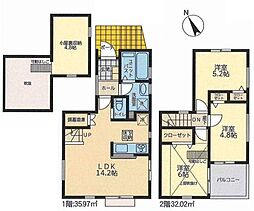 間取り内訳:洋室 5.2帖(1階)・洋室 7.5帖(1階)・洋室 5帖(2階)・リビングダイニングキッチン 14.5帖(2階)