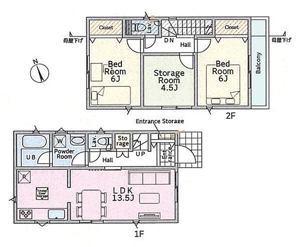 間取り内訳:リビングダイニングキッチン 13.5帖(1階)・洋室 6帖(2階)・収納 4.5帖(2階)・洋室 6帖(2階)