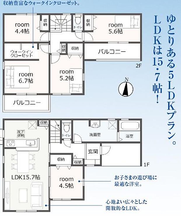 | 間取り | 5LDK 間取り内訳:リビングダイニングキッチン 15.7帖(1階)・洋室 4.5帖(2階)・洋室 6.7帖(2階)・洋室 5.6帖(2階)・洋室 5.2帖(2階)・洋室 4.4帖(2階) |
