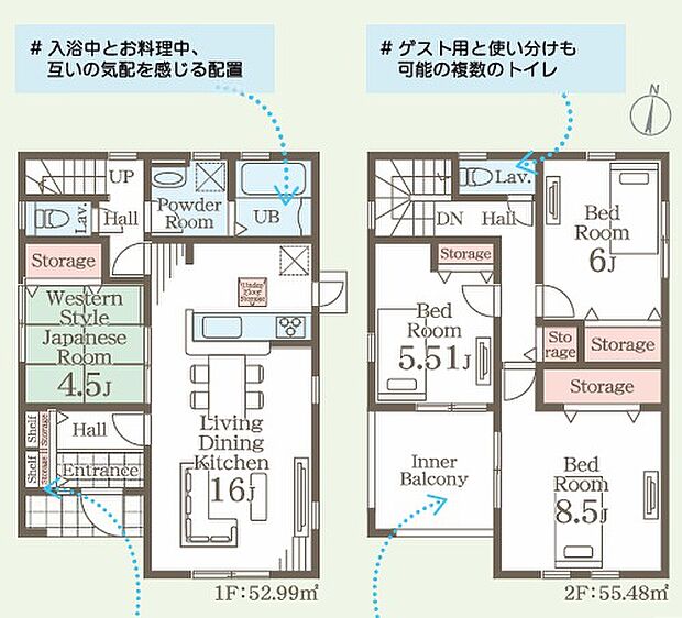 | 間取り | 4LDK 間取り内訳:リビングダイニングキッチン 16帖(1階)・和室 4.5畳(1階)・洋室 8.5帖(2階)・洋室 6帖(2階)・洋室 5.5帖(2階) |
