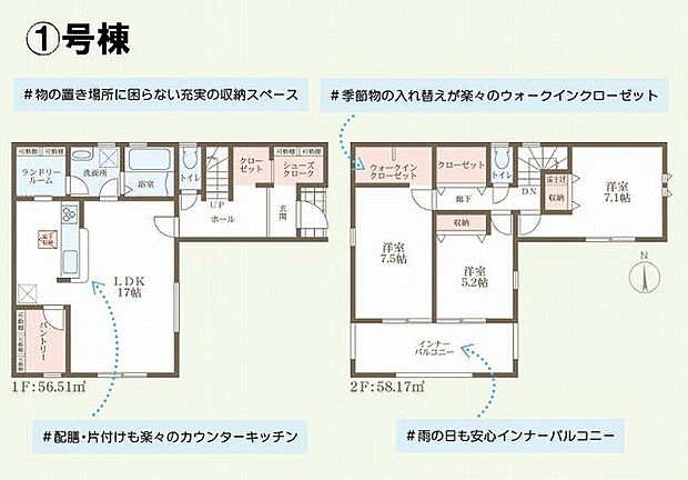 | 間取り | 3LDK 間取り内訳:リビングダイニングキッチン 17帖(1階)・洋室 5.2帖(2階)・洋室 7.1帖(2階)・洋室 7.5帖(2階) |