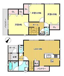 | 間取り | 3LDK 間取り内訳:洋室 8帖・洋室 6.2帖・洋室 5.2帖・リビングダイニングキッチン 16帖 |
