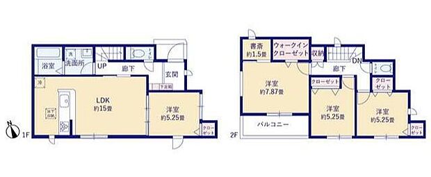 | 間取り | 4LDK(書斎、WIC) 間取り内訳:リビングダイニングキッチン 15帖(1階)・洋室 5.2帖(1階)・洋室 7.8帖(2階)・洋室 5.2帖(2階)・洋室 5.2帖(2階) |