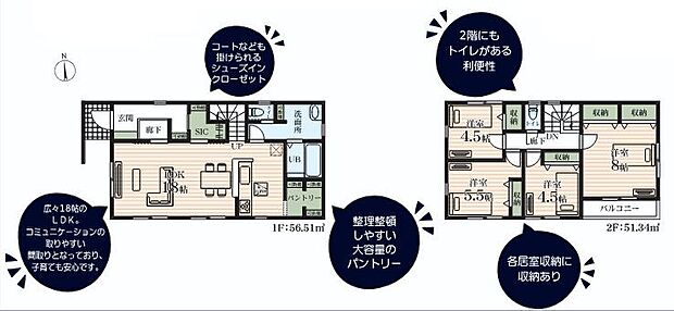 • 備考欄:LDK18帖以上の4LDKとゆとりある広さです コミュニケーションも取りやすい間取りです。前面道路は7mと開放感良好です。カースペースは2台駐車可能で、ご夫婦それぞれでマイカー所有も可能です。全居室収納つきに加えて、パントリーやSICなど収納豊富。