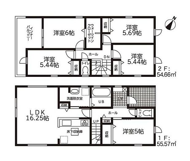 間取り内訳:リビングダイニングキッチン 16.2帖(1階)・洋室 5帖(1階)・洋室 6帖(2階)・洋室 5.6帖(2階)・洋室 5.4帖(2階)・洋室 5.4帖(2階)