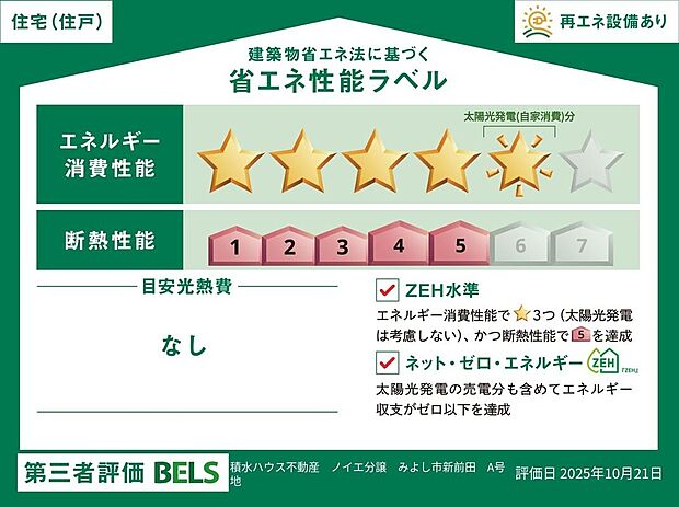 星マークの数が多いほどエネルギー消費性能が高いことを示しています。再エネ設備のない住宅は★0~★4の5段階評価、再エネ設備がある住宅は★0~★6の7段階評価となります。