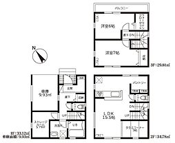 | 間取り | 3LDK 間取り内訳:リビングダイニングキッチン 18帖(1階)・洋室 7帖(2階)・洋室 6.7帖(2階)・洋室 5.7帖(2階) |