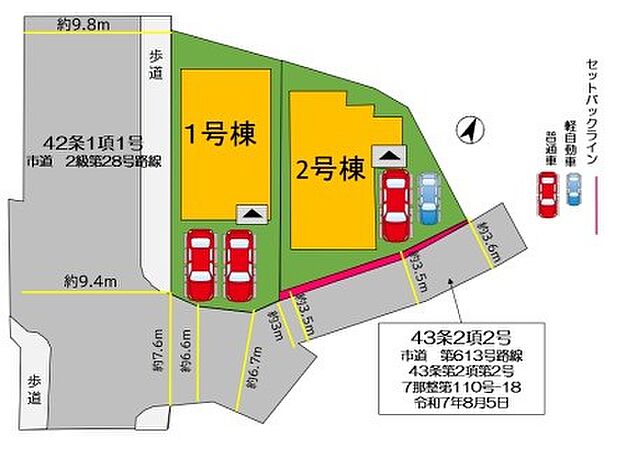 2号棟:南西4m /1号棟:南東3m 北西9.8m