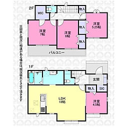 間取り内訳:リビングダイニングキッチン 18帖(1階)・洋室 4.5帖(1階)・洋室 7帖(2階)・洋室 6帖(2階)・洋室 5.2帖(2階)
