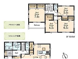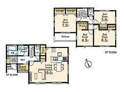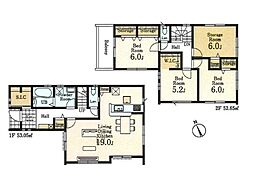 | 間取り | 3SLDK 間取り内訳:洋室 6帖(2階)・洋室 6帖(2階)・洋室 5.2帖(2階)・リビングダイニングキッチン 19帖(1階)・収納 6帖(2階) |
