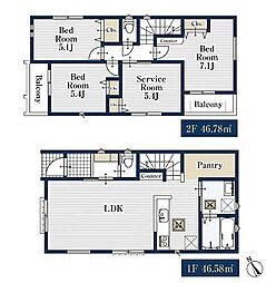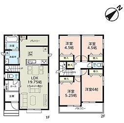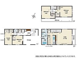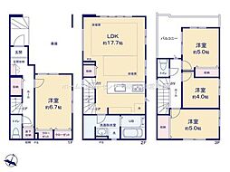 | 間取り | 3LDK 間取り内訳:洋室 5.9帖(2階)・リビングダイニングキッチン 22.4帖(1階)・洋室 7帖(2階)・洋室 4.9帖(2階) |