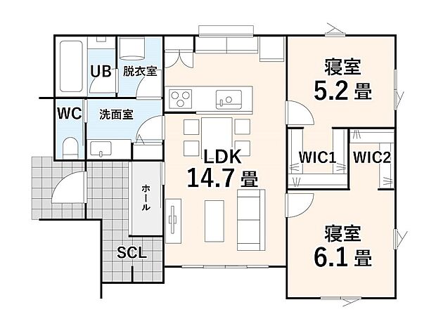 間取り内訳:リビングダイニングキッチン 14.7帖(1階)・洋室 5.2帖(1階)・洋室 6.1帖(1階)