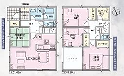 | 間取り | 4LDK(全居室収納) 間取り内訳:リビングダイニングキッチン 19帖(1階)・洋室 7.5帖(2階)・洋室 5.5帖(2階)・洋室 5帖(2階)x2 |
