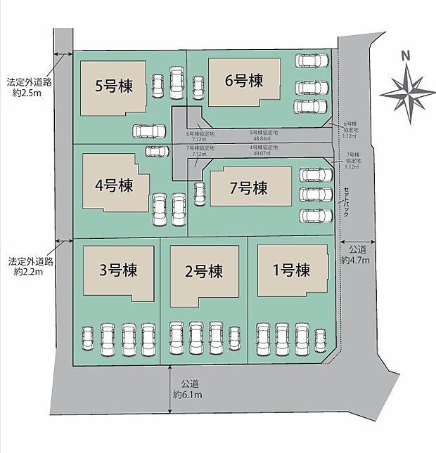 2号棟:南6.1m /7号棟:東4.7m /1号棟:南6.1m 東4.7m /6号棟:東4.7m /4号棟:東4.7m /3号棟:南6.1m