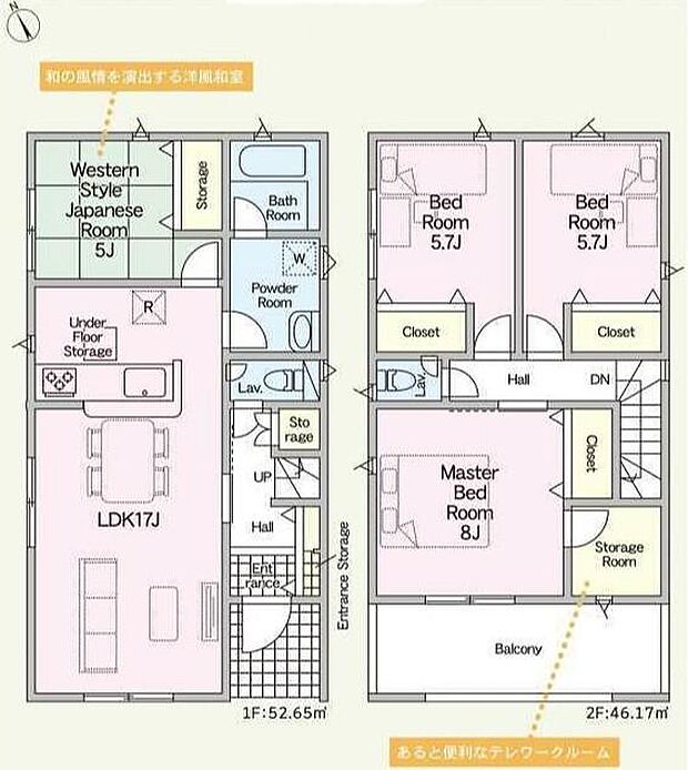 | 間取り | 4SLDK 間取り内訳:リビングダイニングキッチン 17帖(1階)・和室 5畳(1階)・洋室 5.7帖(2階)・洋室 5.7帖(2階)・洋室 8帖(2階)・収納 |
