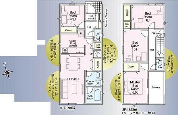 | 間取り | 4LDK 間取り内訳:リビングダイニングキッチン 15帖(1階)・洋室 4.2帖(1階)・洋室 6帖(2階)・洋室 6帖(2階)・洋室 6.5帖(2階) |