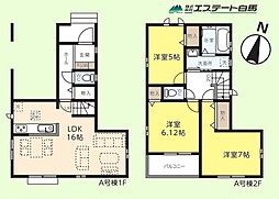 間取り内訳:リビングダイニングキッチン 16帖(1階)・洋室 5帖(2階)・洋室 6.1帖(2階)・洋室 7帖(2階)