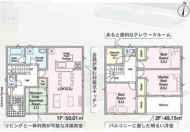 | 間取り | 4LDK(テレワークルーム) 間取り内訳:リビングダイニングキッチン 15.5帖(1階)・和室 3.7畳(1階)・洋室 5.5帖(2階)・洋室 6.5帖(2階)・洋室 6.1帖(2階) |