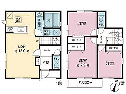 | 間取り | 3SLDK 間取り内訳:リビングダイニングキッチン 15.7帖(1階)・収納 3帖(1階)・洋室 7.5帖(2階)・洋室 4.5帖(2階)x2 |