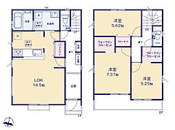 | 間取り | 3LDK 間取り内訳:洋室 7.2帖(2階)・洋室 5.1帖(2階)・洋室 5帖(2階)・リビングダイニングキッチン 17.5帖(1階) |