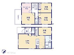 | 間取り | 4LDK 間取り内訳:洋室 11.5帖(2階)・洋室 6.2帖(2階)・洋室 5.2帖(2階)・洋室 5帖(1階)・リビングダイニングキッチン 17帖(1階) |