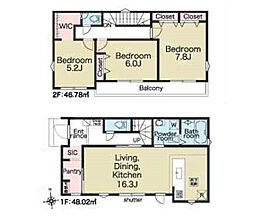 間取り内訳:リビングダイニングキッチン 15帖(1階)・洋室 5帖(1階)・洋室 7.5帖(2階)・洋室 6帖(2階)・洋室 5.2帖(2階)
