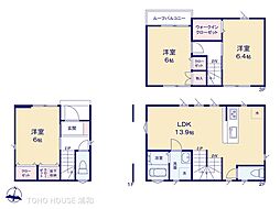 | 間取り | 3LDK 間取り内訳:リビングダイニングキッチン 13.9帖(2階)・洋室 6帖(1階)・洋室 6帖(3階)・洋室 6.4帖(3階) |