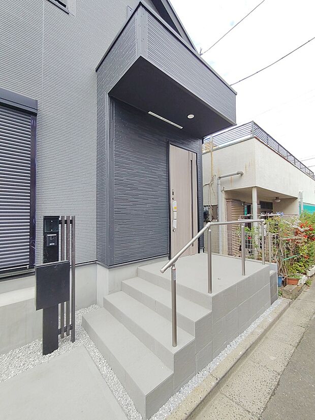 • 【現地外観写真】2台分のカースペース、駐輪スペースも確保できます。多彩な収納のあるこだわりの邸宅です。