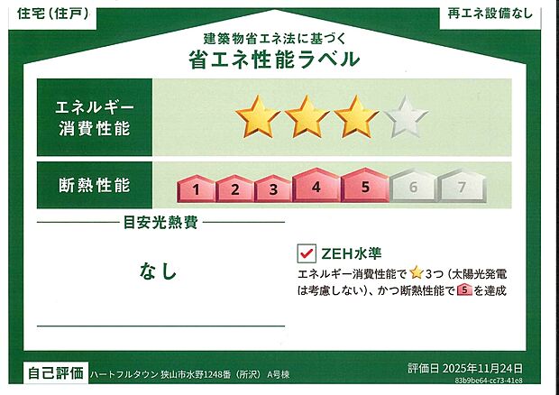 - 星マークの数が多いほどエネルギー消費性能が高いことを示しています。再エネ設備のない住宅は★0~★4の5段階評価、再エネ設備がある住宅は★0~★6の7段階評価となります。