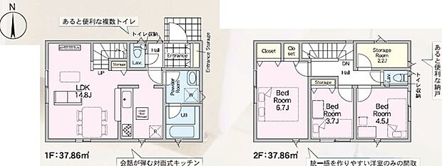 | 間取り | 3SLDK 間取り内訳:リビングダイニングキッチン 14.8帖(1階)・洋室 6.7帖(2階)・洋室 4.5帖(2階)・洋室 3.7帖(2階)・収納 2.2帖(2階) |