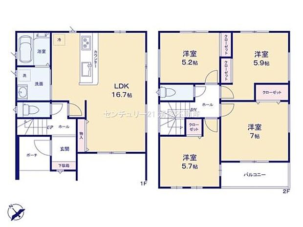 | 間取り | 4LDK 間取り内訳:リビングダイニングキッチン 16.7帖(1階)・洋室 7帖(2階)・洋室 5.9帖(2階)・洋室 5.7帖(2階)・洋室 5.2帖(2階) |