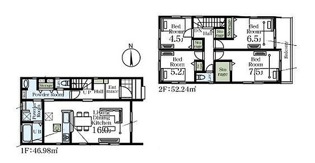 | 間取り | 4LDK 間取り内訳:リビングダイニングキッチン 16帖(1階)・洋室 7.5帖(2階)・洋室 6.5帖(2階)・洋室 5.2帖(2階)・洋室 4.5帖(2階) |