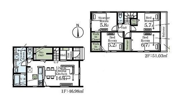 | 間取り | 3SLDK 間取り内訳:リビングダイニングキッチン 16.1帖(1階)・洋室 6.7帖(2階)・洋室 5.8帖(2階)・洋室 5.7帖(2階)・洋室 5.2帖(2階) |