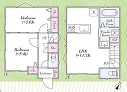 | 間取り | 2LDK 間取り内訳:洋室 5.9帖(1階)・洋室 5.6帖(1階)・リビングダイニングキッチン 11.7帖(2階) |