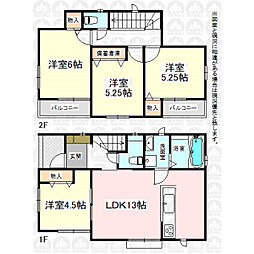 | 間取り | 4LDK 間取り内訳:リビングダイニングキッチン 15帖(1階)・洋室 4.5帖(1階)・洋室 7帖(2階)・洋室 6帖(2階)・洋室 5.2帖(2階) |