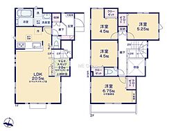 | 間取り | 4LDK 間取り内訳:リビングダイニングキッチン 20.2帖(1階)・洋室 5.2帖(2階)・洋室 5.5帖(2階)・洋室 5.5帖(2階)・洋室 7.5帖(2階) |