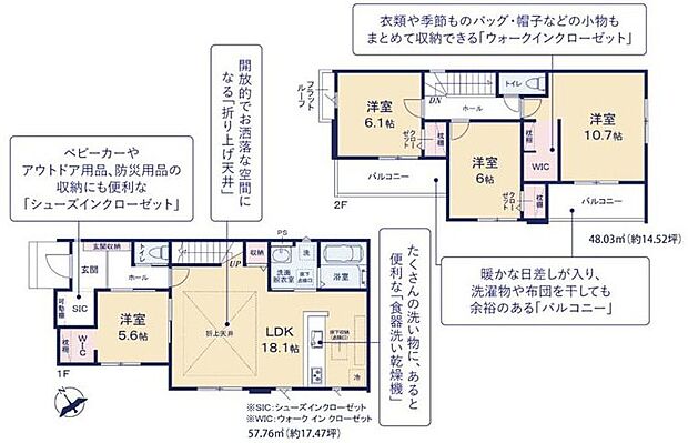 間取り内訳:リビングダイニングキッチン 18.1帖(1階)・洋室 5.6帖(1階)・洋室 6.1帖(2階)・洋室 6帖(2階)・洋室 10.7帖(2階)
