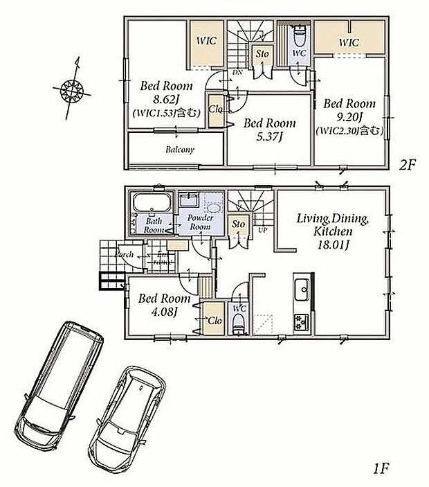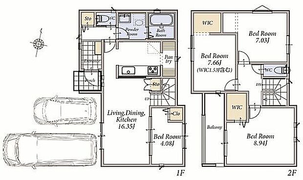 並列駐車可能なカースペース付。バスルームには浴室乾燥機採用の新築分譲住宅。