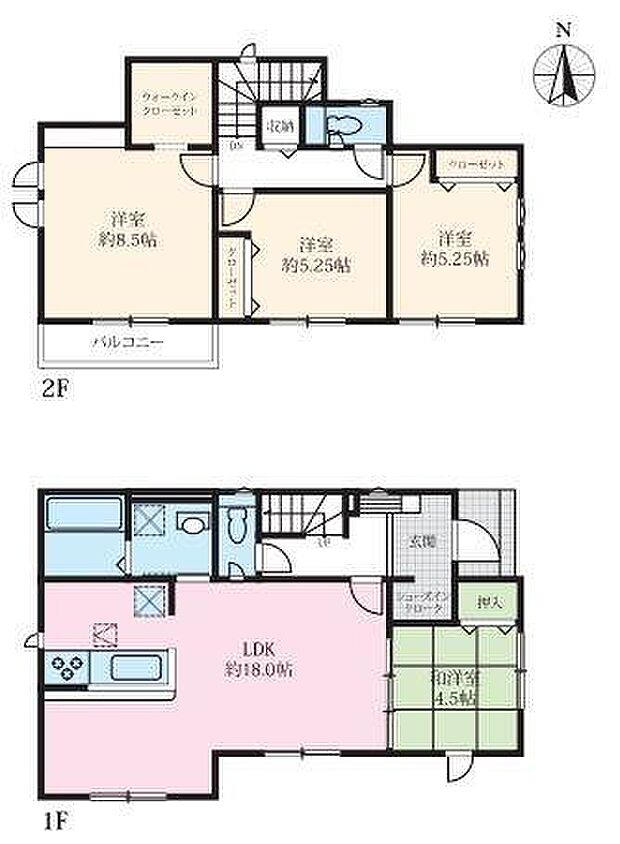 | 間取り | 4LDK 間取り内訳:リビングダイニングキッチン 18帖(1階)・和室 4.5畳(1階)・洋室 8.5帖(2階)・洋室 5.2帖(2階)・洋室 5.2帖(2階) |