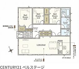 LDK18帖の広々3LDK平屋。全居室収納付きで、制震装置SAFE365搭載の安心住宅です。