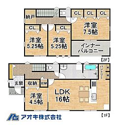 間取り内訳:リビングダイニングキッチン 16帖(1階)・和室 4.5畳(1階)・洋室 5.2帖(2階)・洋室 5.2帖(2階)・洋室 7.5帖(2階)