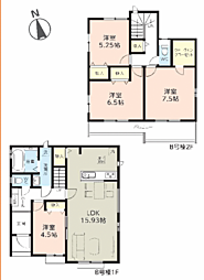 間取り内訳:収納 6.6帖(1階)・収納 7.1帖(1階)・リビングダイニングキッチン 13.8帖(2階)・洋室 6.3帖(2階)・洋室 5.3帖(2階)