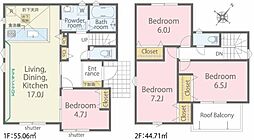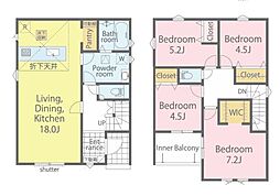 | 間取り | 4LDK 間取り内訳:リビングダイニングキッチン 18帖(1階)・洋室 5.2帖(2階)・洋室 4.5帖(2階)・洋室 4.5帖(2階)・洋室 7.2帖(2階) |