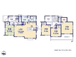 | 間取り | 4LDK 間取り内訳:リビングダイニングキッチン 18.2帖(1階)・和室 5.2畳(1階)・洋室 8帖(2階)・洋室 5.5帖(2階)・洋室 5.2帖(2階) |