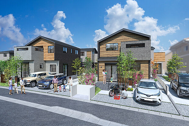 • 【ディティールに凝ったデザイン】スタイリッシュな切妻屋根と素材感あふれる外壁が調和した外観に、シンボルツリーなどの自然の潤いを加え、四季の彩を感じられる開放的な街並みに。
